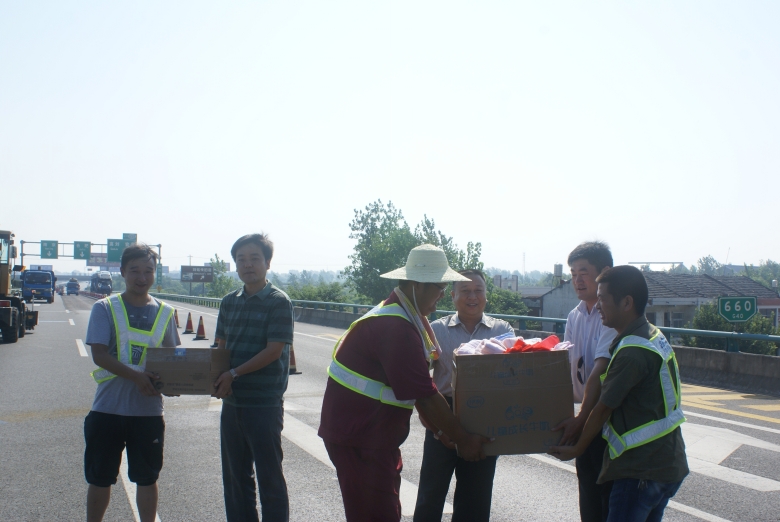 連日來,氣溫節節攀升,酷暑考驗著堅守在合六葉高速公路養護工程施工一線的職工。8月8日上午,公司領導及工會一行帶著毛巾、花露水、洗發液、香皂,急救藥箱及防暑降溫物品來到高速公路施工現場,親切慰問在烈日下仍辛勤地工作在工程施工最前線的一線職工。總經理萬世林詢問了他們在高溫天氣下的工作、生活情況,叮囑職工在當前持續高溫的不利條件下,安全做好工作的同時,注意休息,勞逸結合,合理調整工作作息時間,采取有效的防暑措施,安全順利地度過高溫季節,保質保量的完成施工任務。